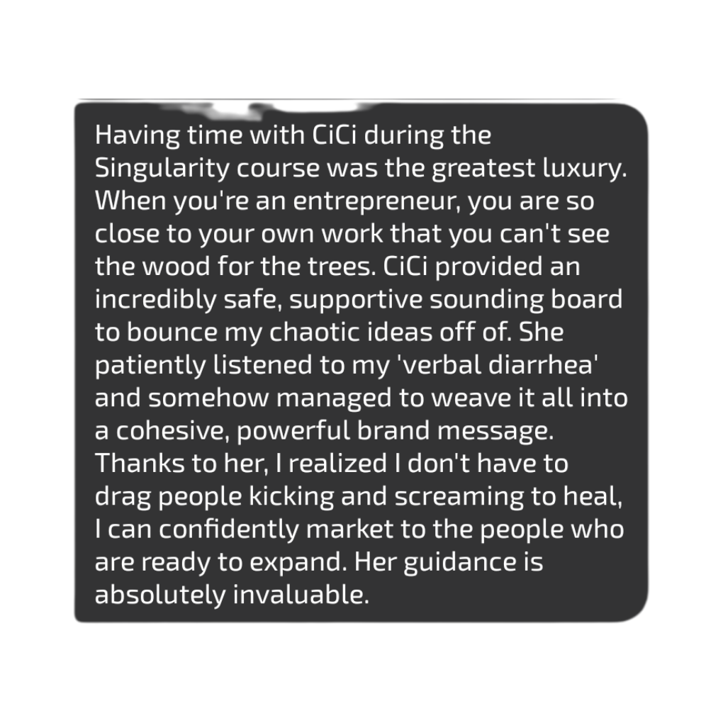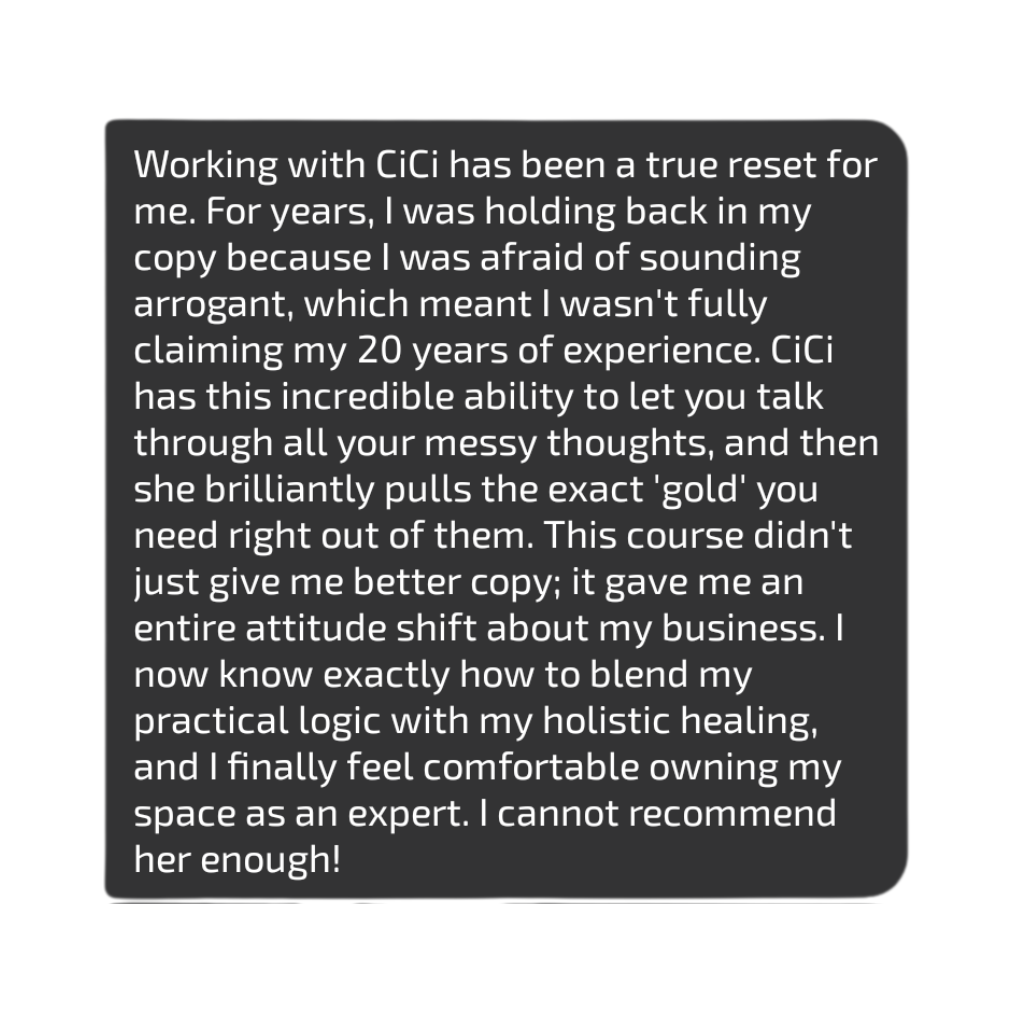 CiCi can go into your brand and copy at a very deep level really quickly. It’s such a relief to have these open kinds of conversations! The way she thinks about sales copy was a huge breakthrough for me.